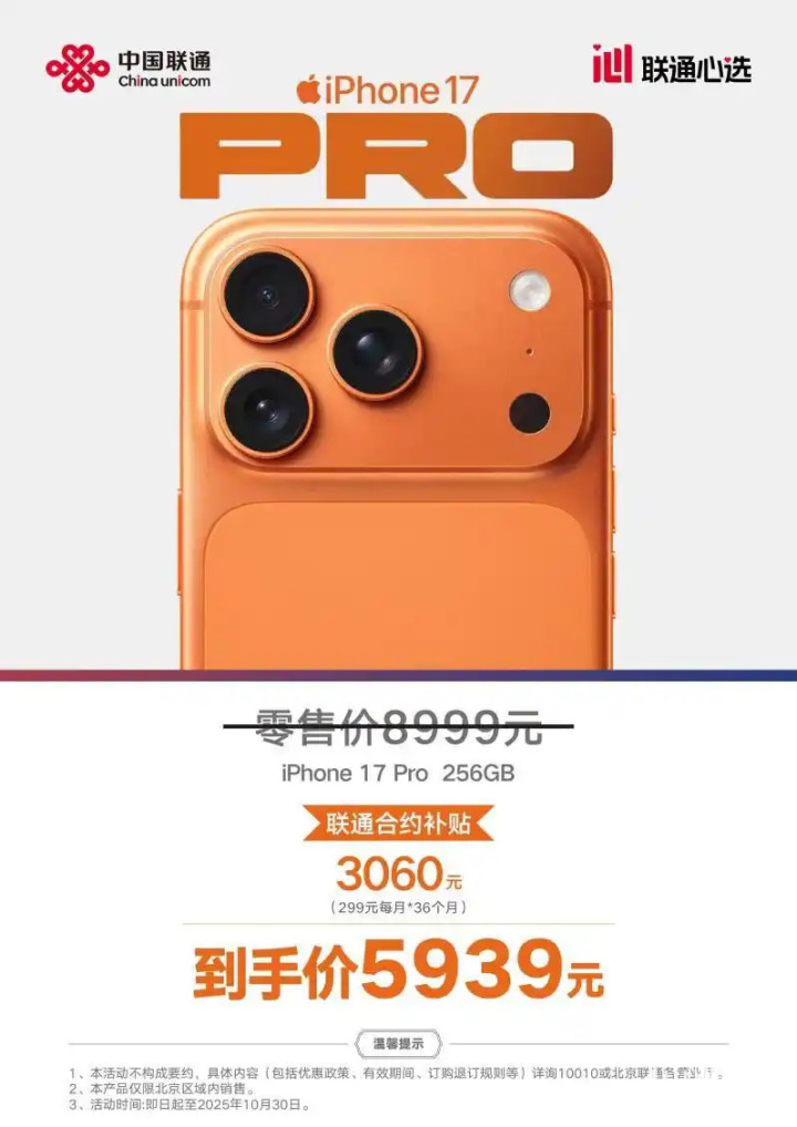 而要对冲涨价,则可以考虑一下通过运营商渠道入手。现在办理北京联通臻宽带套餐并购买iPhone 17系列新机,即可享受合约直降3060元的专属优惠,iPhone 17 Pro到手价仅需5939元。