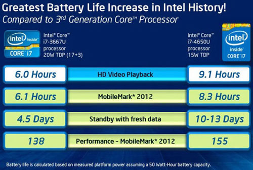 新一代Haswell处理器的笔记本将具有更长的续航时间。根据The Verge的测试在播放1080p视频的情况下使用Haswell处理器的笔记本将能够持续播放3个多小时,在英特尔为媒体提供的数据当中,使用50Wh的电池,当用户让笔记本进入待机状态之后,续航时间将会长达10天之久,因特尔表示全新的Haswell处理器在电池续航能力上是上一代处理器的两倍以上。