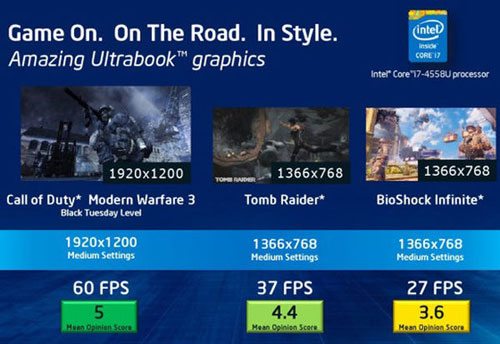 英特尔表示,Haswell处理器当中的集成显卡已经能够玩一些主流的大型游戏,在使命召唤:现代战争3当中,以1080p的画质运行游戏,能够稳定在60FSP,以1366×768的画质玩古墓丽影,FPS大约在37左右,以1366×768画质玩BioShock Infinite,FPS就要稍低一些,大约在27左右。并且相比于上一代产品,Haswell上全新的核芯显卡将支持DX11.1与Open CL 1.2、优化了3D性能,支持HDMI、DP、DVI、VGA接口标准,可以实现三屏独立输出。