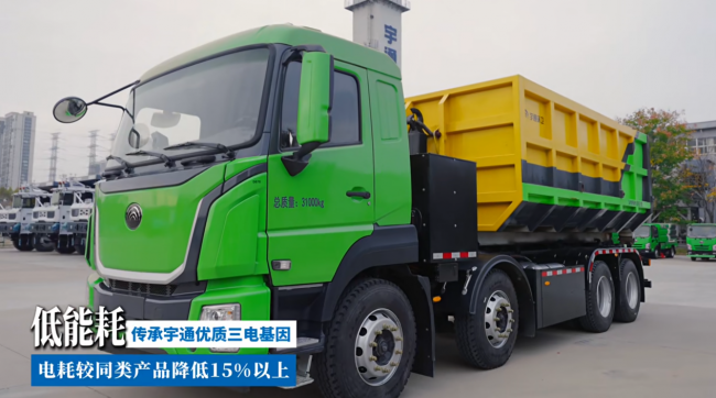 垃圾转运车辆日均行驶里程长、运载量大,能耗是运营成本的关键变量。宇通32t纯电动车厢可卸式垃圾车通过环卫专用底盘及整车轻量化设计,有效降低无效自重。结合新一代高比能磷酸铁锂电池、高效电驱电控系统,整车综合电耗较市场同类产品降低15%以上,在日常运营中为用户带来显著的成本节约。